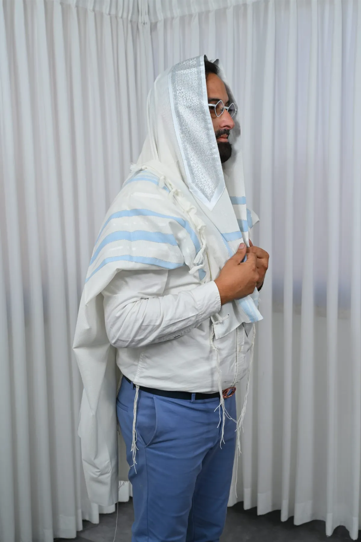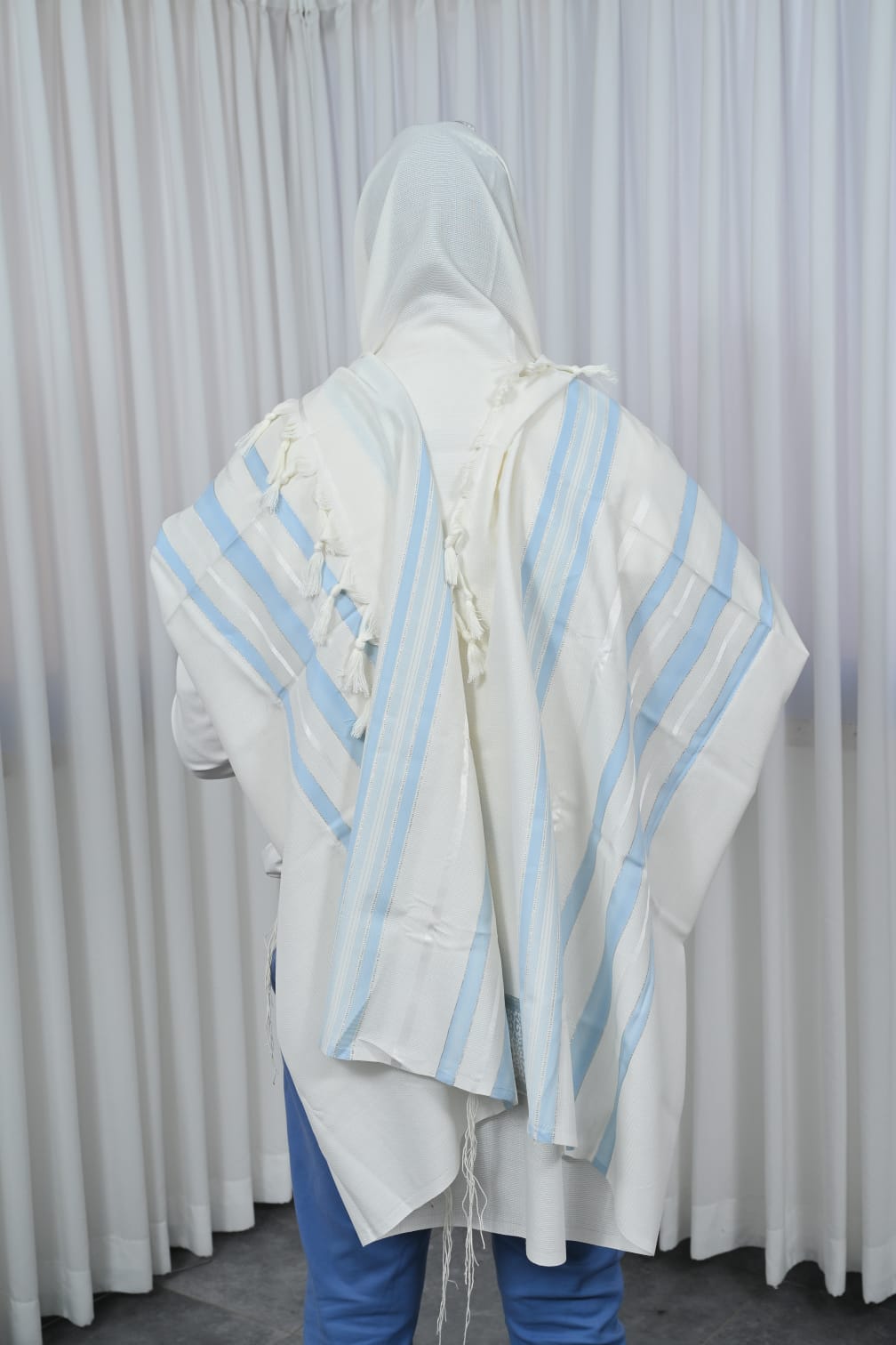 טלית תשבץ מהודרת לא מחליקה, דגם פסי תכלת