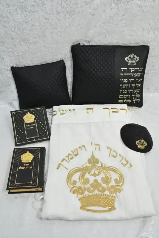 סט לטלית ותפילין דמוי עור שחור מדוגם, כתר זהב